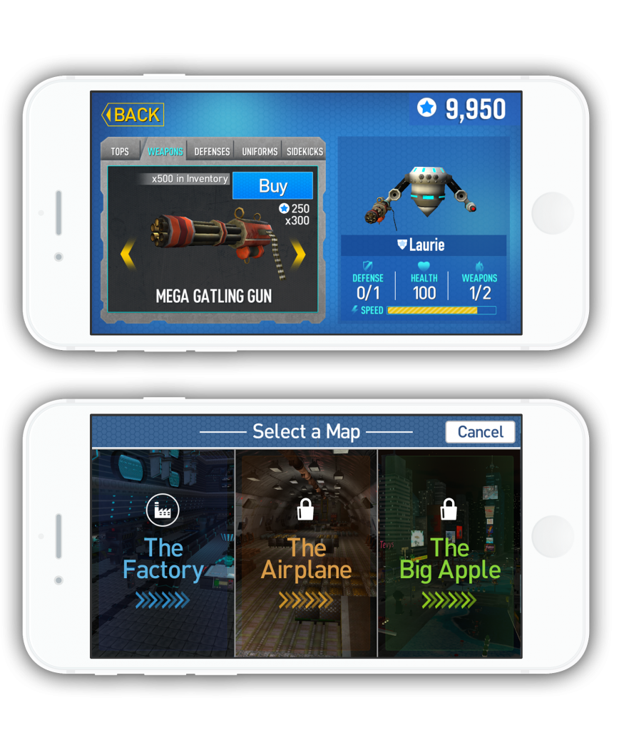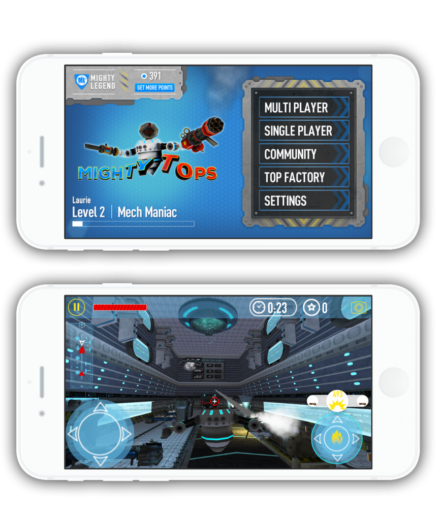 Mighty Tops featured fast paced multiplayer and single player action, with the ability to upgrade your character with purchases in-game.