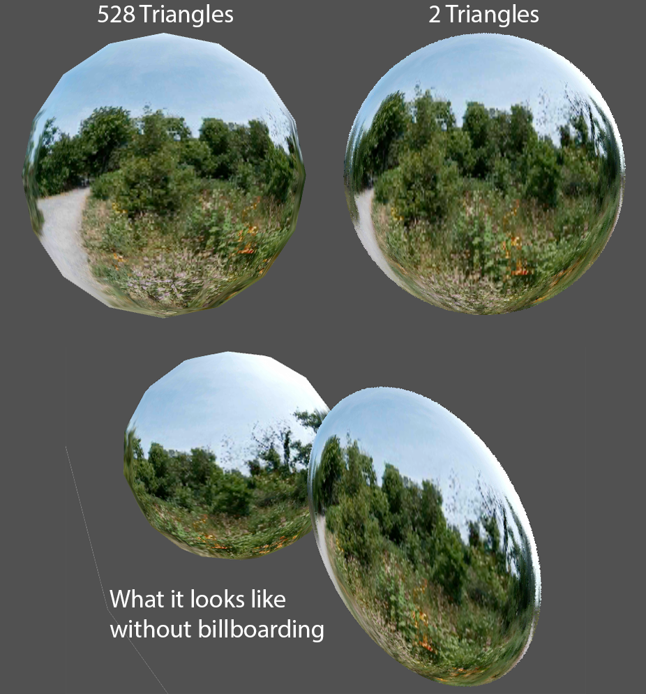 Balancing performance and visual fidelity was a primary focus of my time at VRB Foto. For example, I pushed for optimizing the many “photospheres” visible in our application by replacing them with normal mapped quads. Not only did this reduce the number of triangles on screen, it also allowed us to make our spheres actually look… well, spherical! Examples of the before and after (left and right) are shown below. Note: Billboarding was always on for these objects, and was only turned off for demonstration purposes.